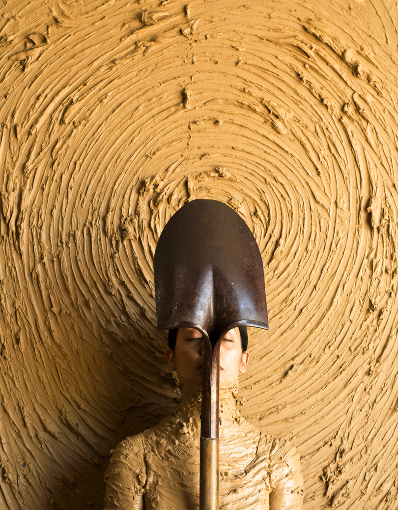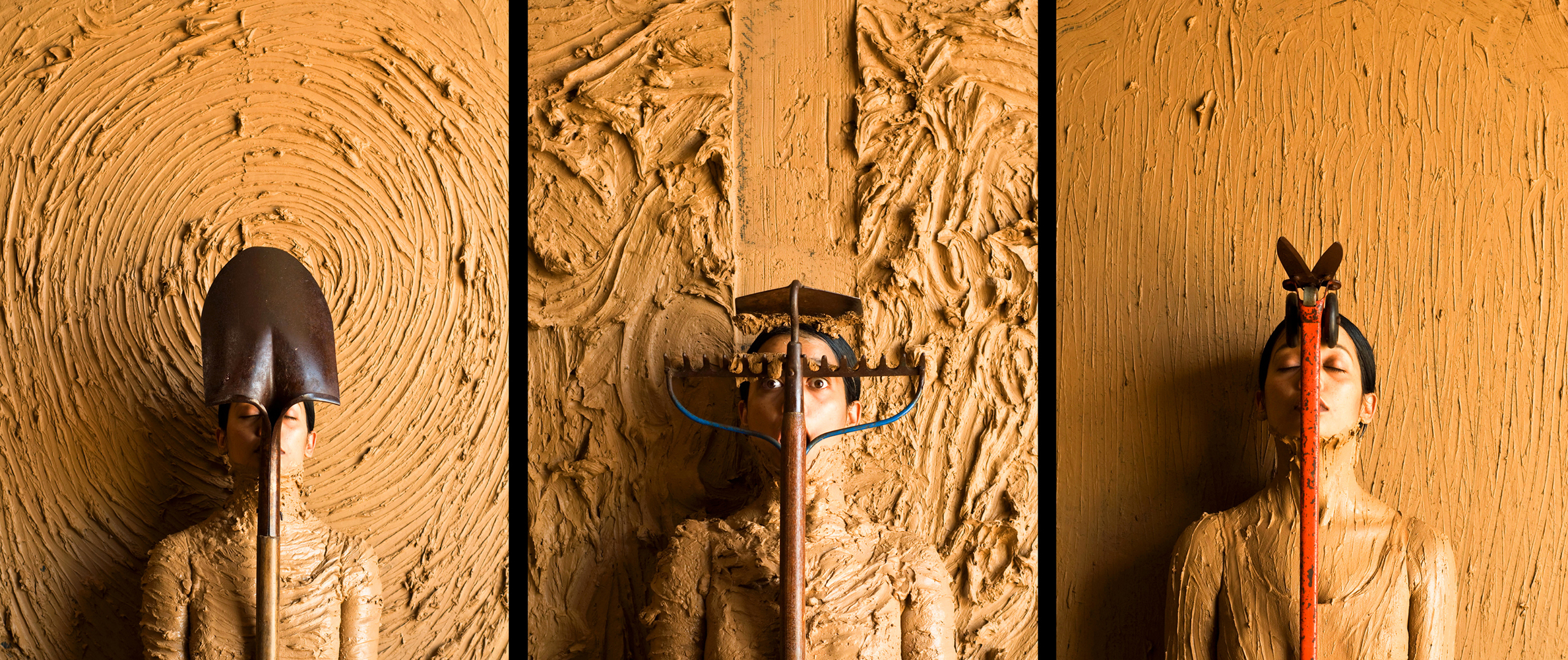 Self Portrait / 2013 / wet clay and used garden tools / Digital photograph / 41" x 95" / Indiana, USA