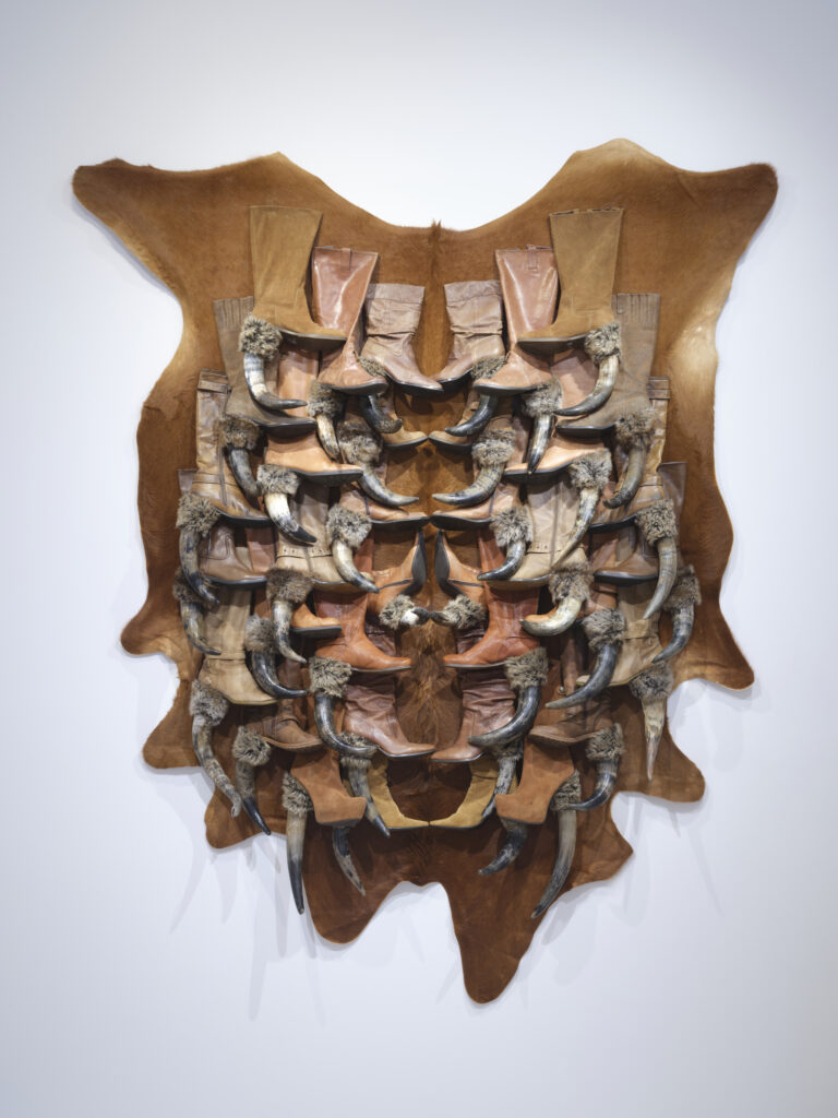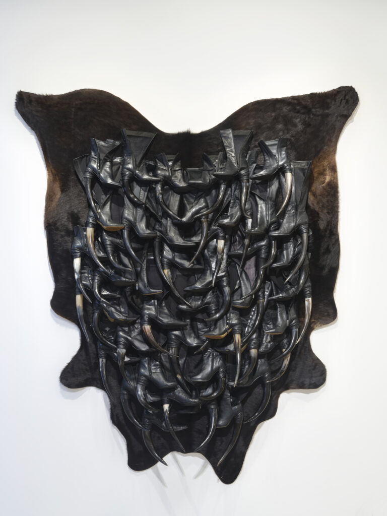 Sex, Sexuality, and Society – EL SALVADOR / 2023 / Used shoes, animal horn, hide / 95″ × 76″ × 10.5″ / USA