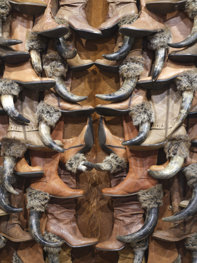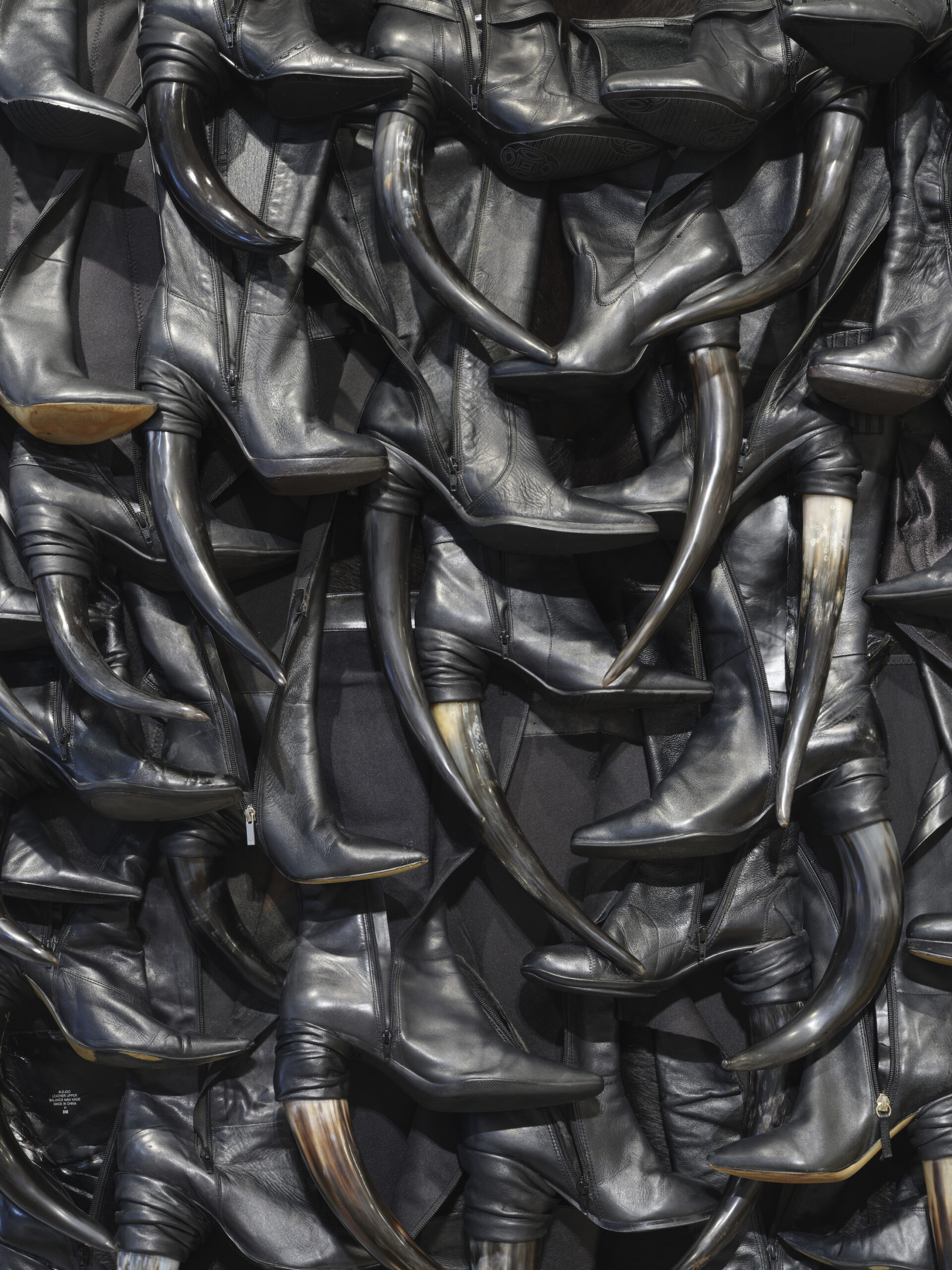 Sex, Sexuality, and Society – BOTSWANA / 2023 / Used shoes, animal horn, hide / 91″ × 81″ × 13″ / USA