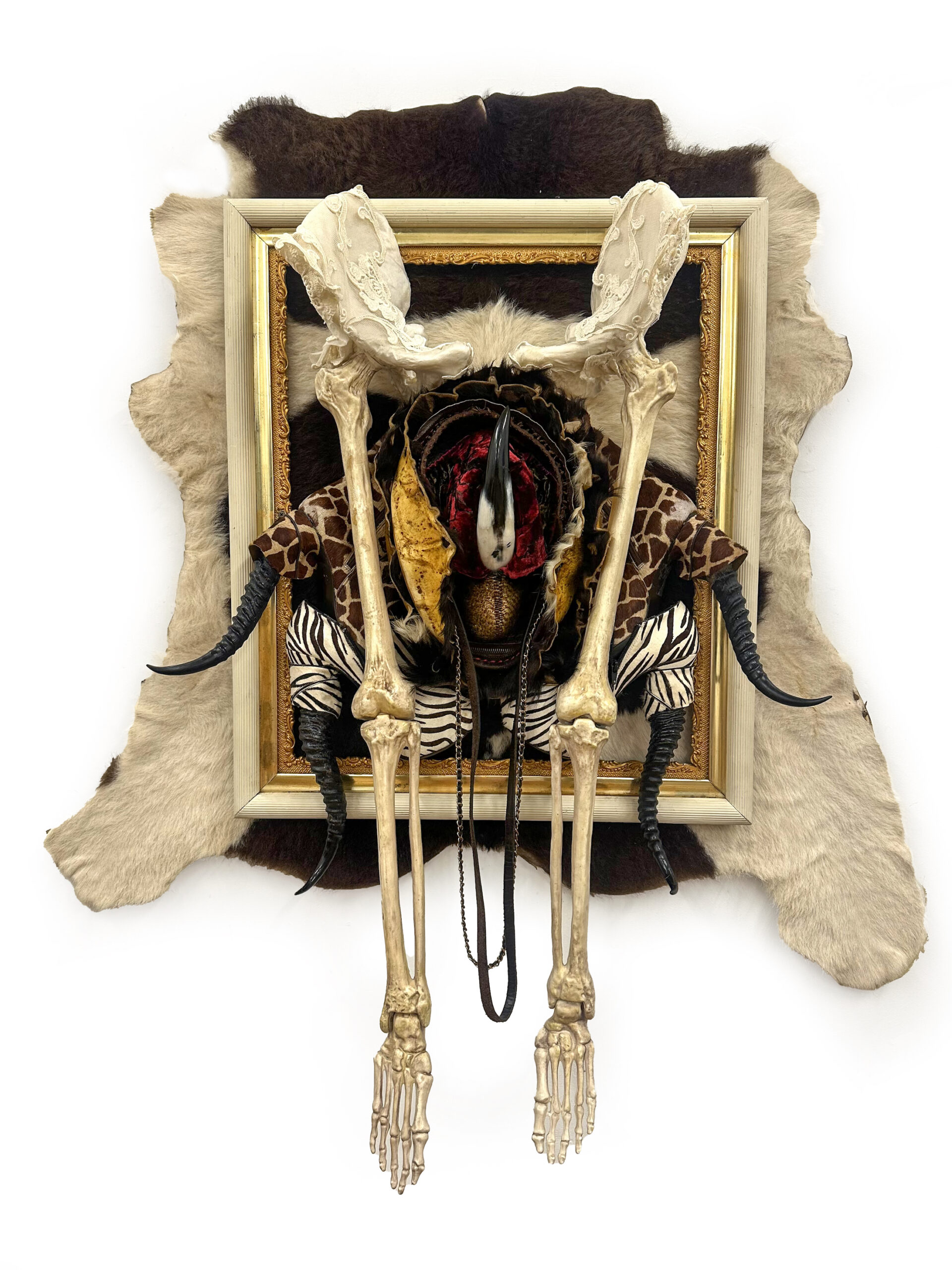 Sex, Sexuality, and Society – JAMAICA / 2023 / Used shoes, used handbag, hide, fabric, animal horn and skeleton / 55″ × 44″ × 7″ / USA