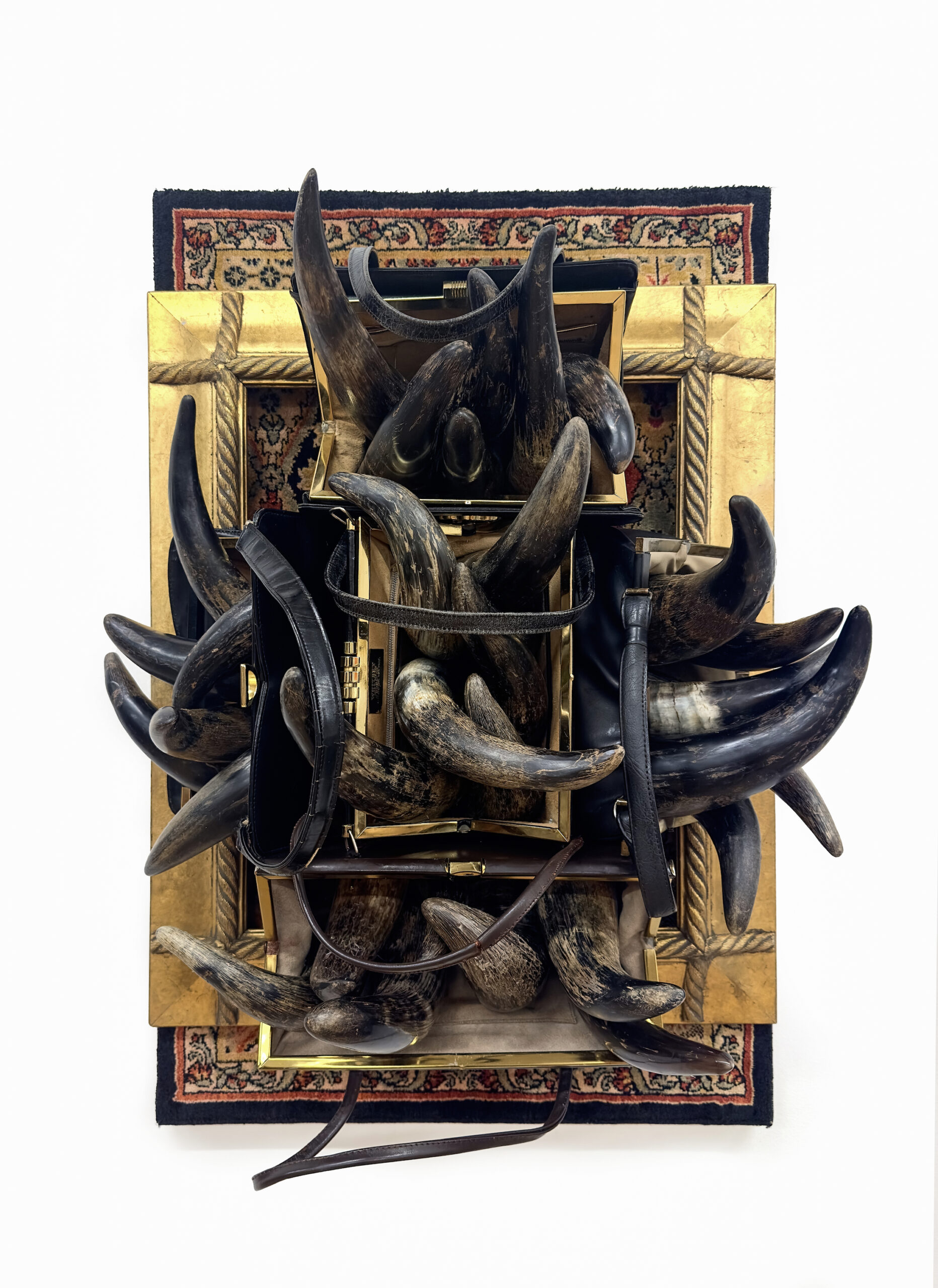 Sex, Sexuality, and Society – DOMINICA / 2025 / Used handbag, used carpet, gold frame, animal horns / 34.5″ × 23″ × 15″ / USA